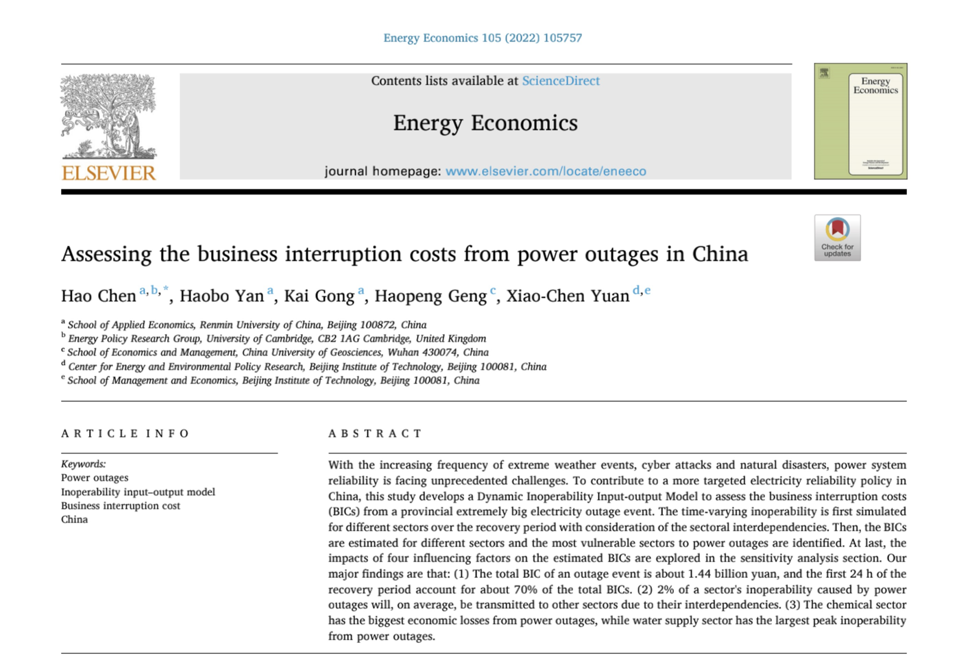 Dr. Hao Chen recently had a paper published in the Energy Economics. The paper titled‘Assessing the business interruption costs from power outages in China’, was coauthored with Haobo Yan and Kai Gong from School of Applied Economics, Renmin University of China, Haopeng Geng from School of Economics and Management, China University of Geosciences,XIao-Chen Yuan from Center for Energy and Environmental Policy Research, Beijing Institute of Technology.