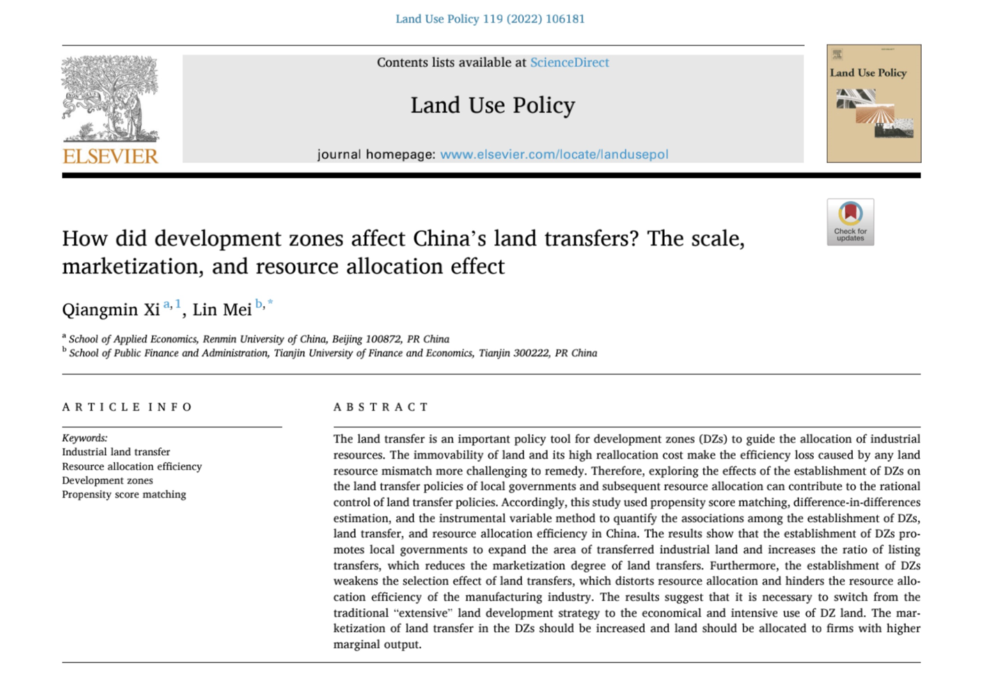 Dr. Qiangmin Xi recently had a paper published in the Land Use Policy. The paper titled‘How did development zones affect China’s land transfers? The scale, marketization, and resource allocation effect’, was coauthored with Lin Mei from School of Public Finance and Administration, Tianjin University of Finance and Economics.