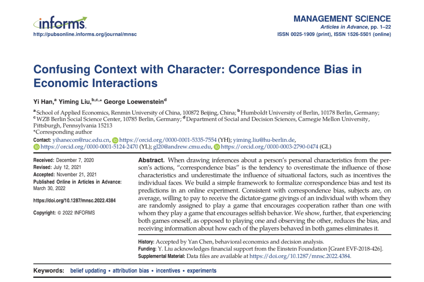 Dr. Yi Han recently had a paper published in the Energy Economics. The paper titled‘ Confusing Context with Character: Correspondence Bias in Economic Interactions’, was coauthored with Yiming Liu from Humboldt University of Berlin, George Loewenstein from Department of Social and Decision Sciences, Carnegie Mellon University.