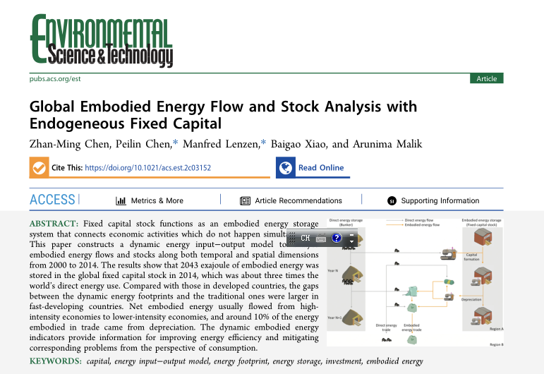 Dr. Zhan-Ming Chen recently had a paper published in the Environmental Science & Technology. The paper titled‘Global Embodied Energy Flow and Stock Analysis with Endogeneous Fixed Capital’, was coauthored with Peilin Chen from School of Applied Economics, Renmin University of China, Manfred Lenzen, Baigao Xiao, and Arunima Malik.