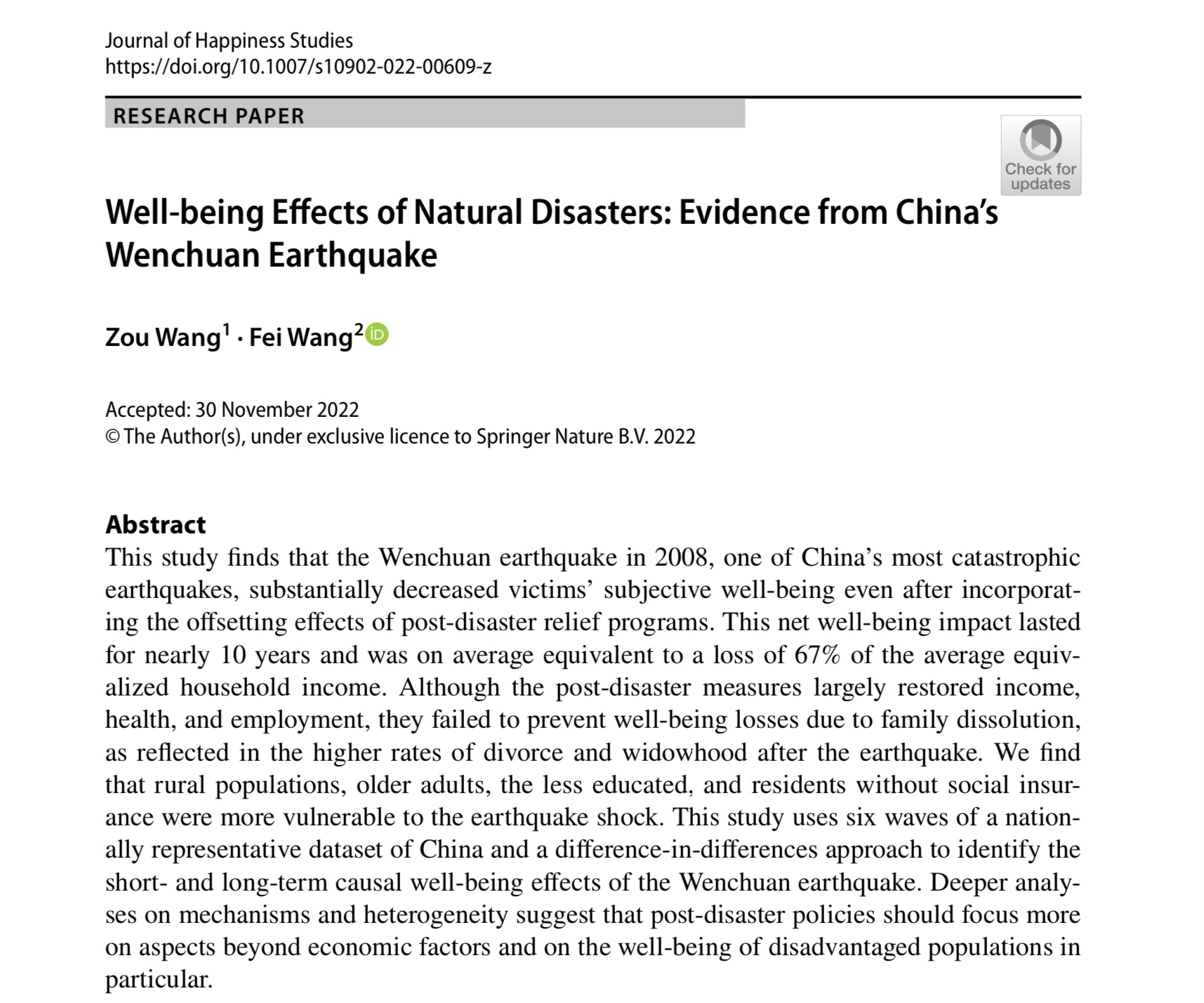 The student of Applied Economics, Renmin University of China Zou Wang recently had a paper published in the Journal of Happiness Studies. The paper titled‘ Well‐being Effects of Natural Disasters: Evidence from China’s Wenchuan Earthquake’, was coauthored with Fei Wang from School of Labor and Human...