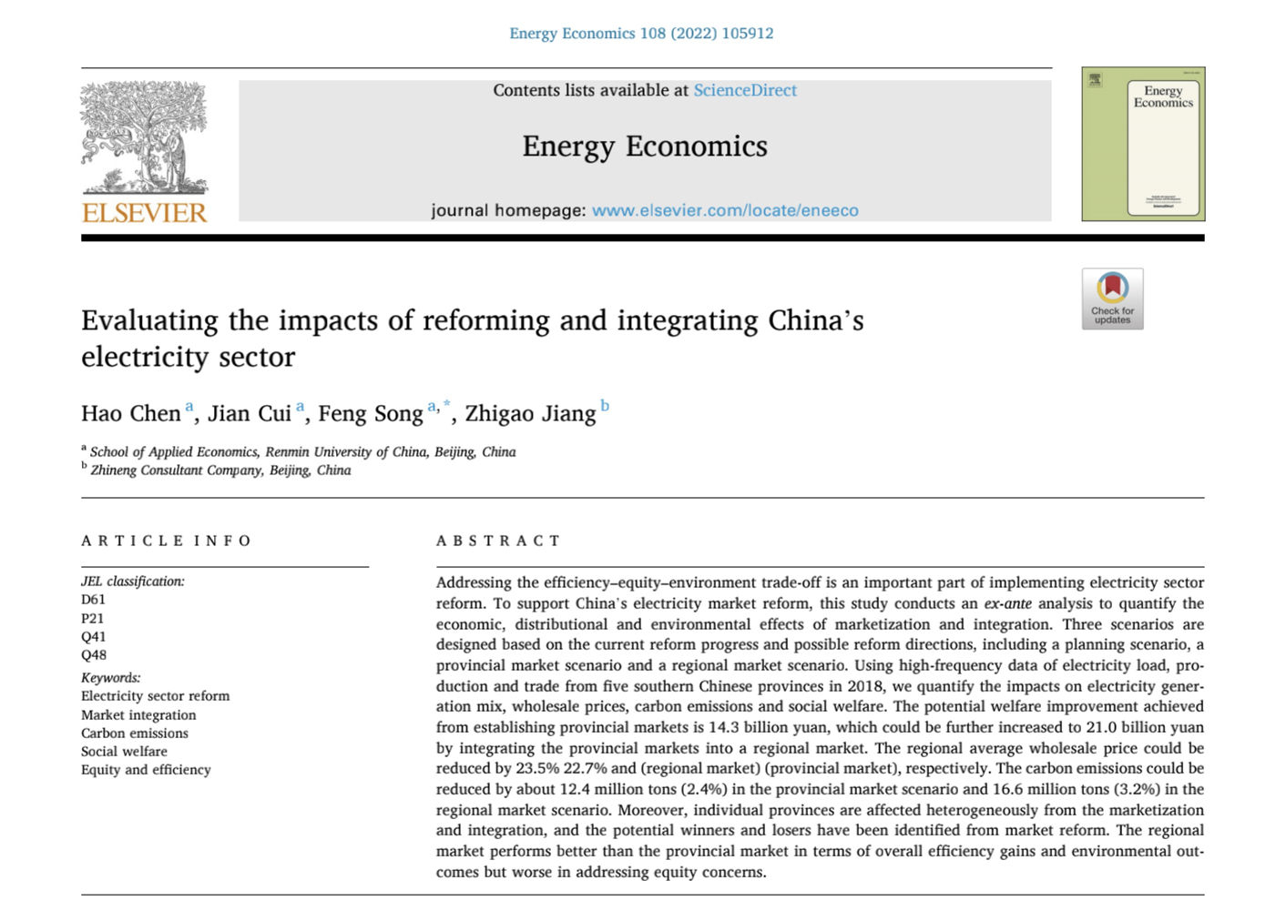 Dr. Hao Chen recently had a paper published in the Energy Economics. The paper titled‘Evaluating the impacts of reforming and integrating China’s electricity sector’, was coauthored with Jian Cui and Feng Song from School of Applied Economics, Renmin University of China, Zhigao Jiang from Zhineng Consultant Company.