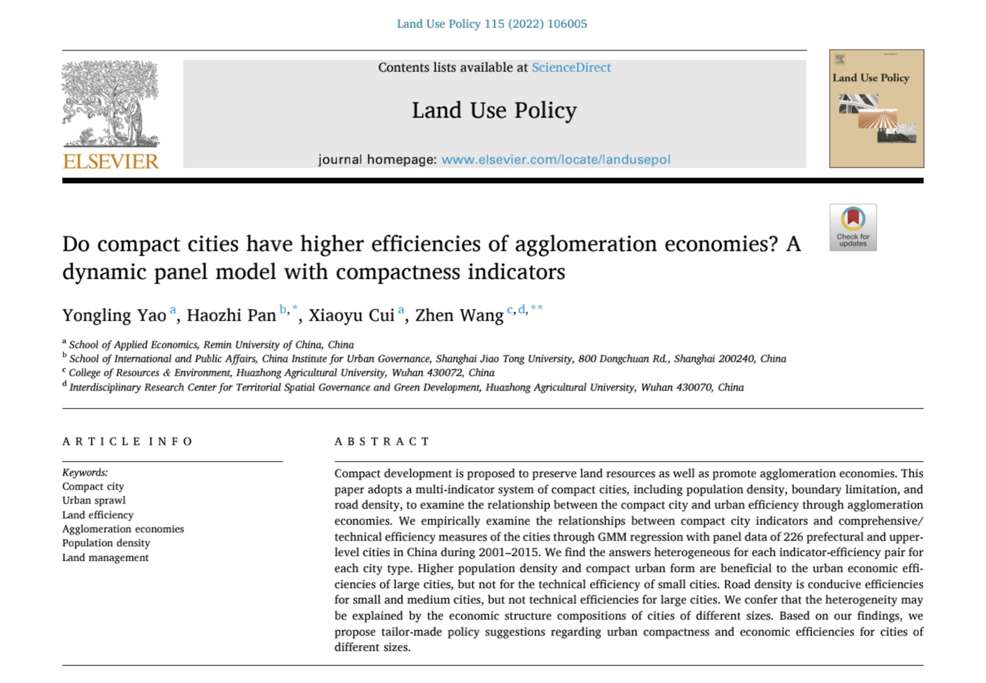 Dr. Yongling Yao recently had a paper published in the Land Use Policy.The paper titled‘Do compact cities have higher efficiencies of agglomeration economies? A dynamic panel model with compactness indicators’, was coauthored with Haozhi Pan from School of International and Public Affairs, China Institute for Urban Governance, Shanghai Jiao Tong University, Xiaoyu Cui from School of Applied Economics, Remin University of China, Zhen Wang from College of Resources & Environment, Huazhong Agricult...
