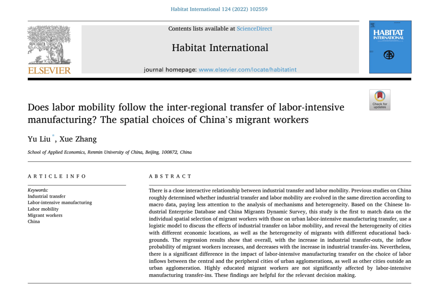 Dr. Yu Liu recently had a paper published in the Habitat International. The paper titled‘Does labor mobility follow the inter-regional transfer of labor-intensivemanufacturing? The spatial choices of China’s migrant workers’, was coauthored with Xue Zhang from School of Applied Economics, Renmin Uni...