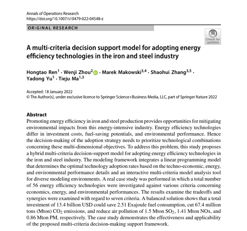 Dr. Wenji Zhou recently had a paper published in theAnnals of Operations Research.The paper titled‘A multi-criteria decision support model for adopting energy effificiency technologies in the iron and steel industry’, was coauthored with Hongtao Ren,Yadong Yu and Tieju Ma from School of Business, East China University of Science and Technology, Marek Makowski and Shaohui Zhang from International Institute for Applied Systems Analysis.