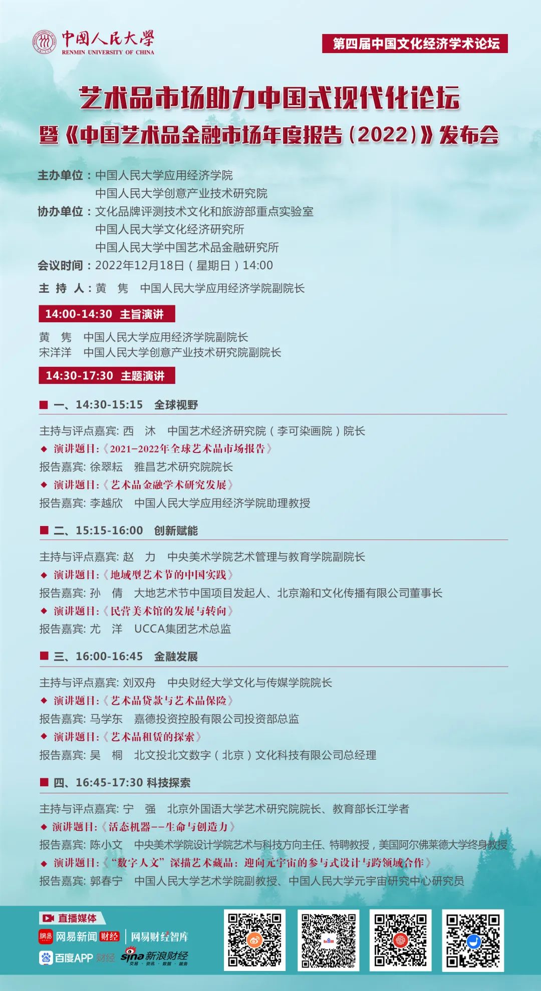中国艺术品市场在提升社会文明素养、传承中华传统文化、传播文化软实力、促进产业升级等方面发挥着重要作用。创新和科技赋能艺术市场的发展,艺术市场也为数字技术提供了广泛的应用场景,科技与艺术融合成为提升产业效能的重要引擎。在此背景下,bl腐漫 和bl腐漫 创意产业技术研究院定于2022年12月18日下午共同主办第四届中国文化经济学术论坛--艺术品市场助力中国式现代化论坛暨《中国艺术品金融市场年度报告(2022)》发布,邀请高校学者和业界专家围绕艺术品市场“创新、科技与未来”深入研讨,助力中国式现代化建设。诚邀您线上参与。