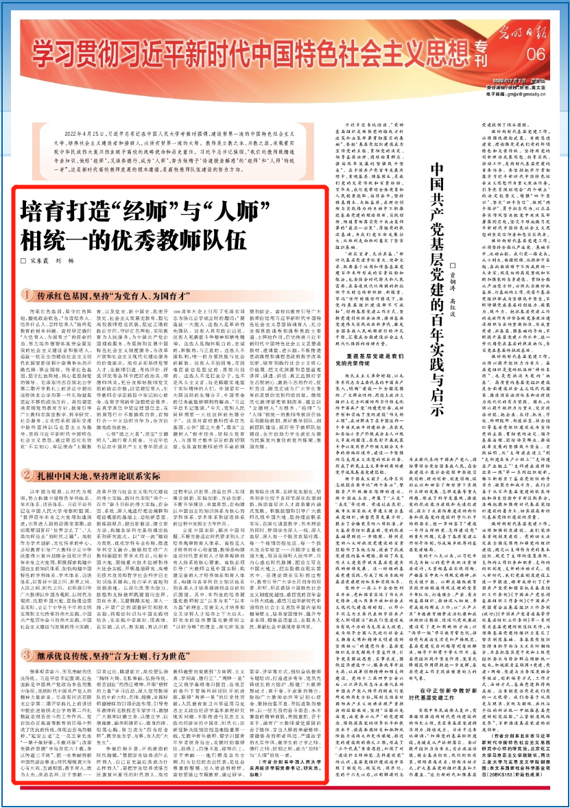 心怀“国之大者”,坚定“立德树人”,践行育人使命。习近平总书记在中国共产主义青年团成立100周年大会上引用了毛泽东同志为陕北公学成立时的题词:“要造就一大批人,这些人是革命的先锋队。这些人具有政治远见。这些人充满着斗争精神和牺牲精神。这些人是胸怀坦白的,忠诚的,积极的,与正直的。这些人不谋私利,唯一的为着民族与社会的解放。这些人不怕困难,在困难面前总是坚定的,勇敢向前的。这些人不是狂妄分子,也不是风头主义者,而是脚踏实地富于实际精神的人们。中国要有一大群这样的先锋分子,中国革命的任务就能够顺利的解决。”习近平总书记强调,“今天,党和人民同样需要一大批这样的先锋分子”。这是对高校教师传承红色基因,心怀“国之大者”,落实“立德树人”根本任务,坚持为党育人、为国育才根本宗旨的殷切期望,也是高校教师始终不渝的理想和信念。高校应教育引导广大教师自觉用习近平新时代中国特色社会主义思想铸魂育人,充分发挥思政课程和课程思政主渠道、主阵地作用,自觉推进习近平新时代中国特色社会主义思想进教材、进课堂、进头脑,不断推进思政课程和课程思政的教学改革创新,培育和践行社会主义核心价值观,把文化渊源和思想道理讲深、讲透、讲活,真正达到对学生启智润心、激扬斗志的作用,使听党话、跟党走成为广大学生青年的思想自觉和行动自觉。继续优化教师管理体制改革,建立以“立德树人”为根本,“经师”与“人师”相统一的教师考核评价体系和激励机制,抓好教学团队、创新团队建设,抓好骨干教师队伍建设,全方位助力学生成长为堪当民族复兴重任的复兴栋梁、强国先锋。