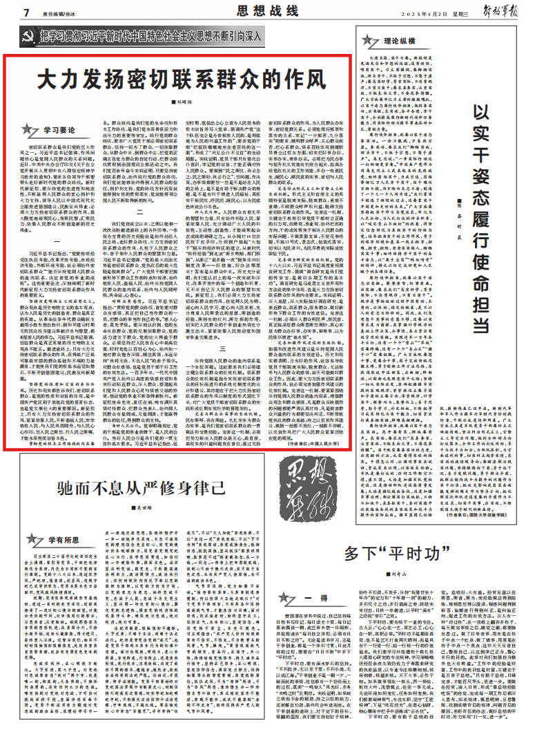 密切联系群众是我们党的三大作风之一。习近平总书记强调,作风问题核心是党同人民群众的关系问题。近日,中共中央办公厅印发《关于在全党开展深入贯彻中央八项规定精神学习教育的通知》,要求各级领导干部要带头走好新时代党的群众路线。新时代新征程,要保持党的先进性和纯洁性、不断赢得人民群众的衷心拥护和大力支持,领导人民以中国式现代化全面推进强国建设、民族复兴伟业,必须大力发扬密切联系群众的作风,最大限度地凝聚民心、集聚民智、汇聚民力,依靠人民群众不断创造新的历史伟业。