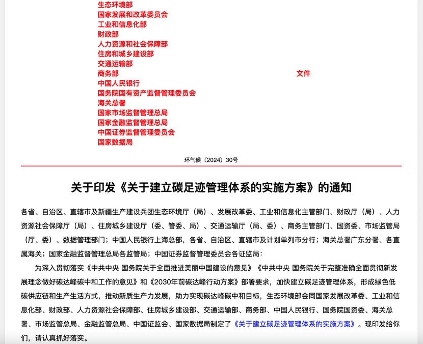 近日,生态环境部等15个部门联合发布了《关于建立碳足迹管理体系的实施方案》。该方案指出,到2027年,初步建立碳足迹管理体系;到2030年,碳足迹管理体系将更加完善,应用场景更加丰富。具体措施如下: