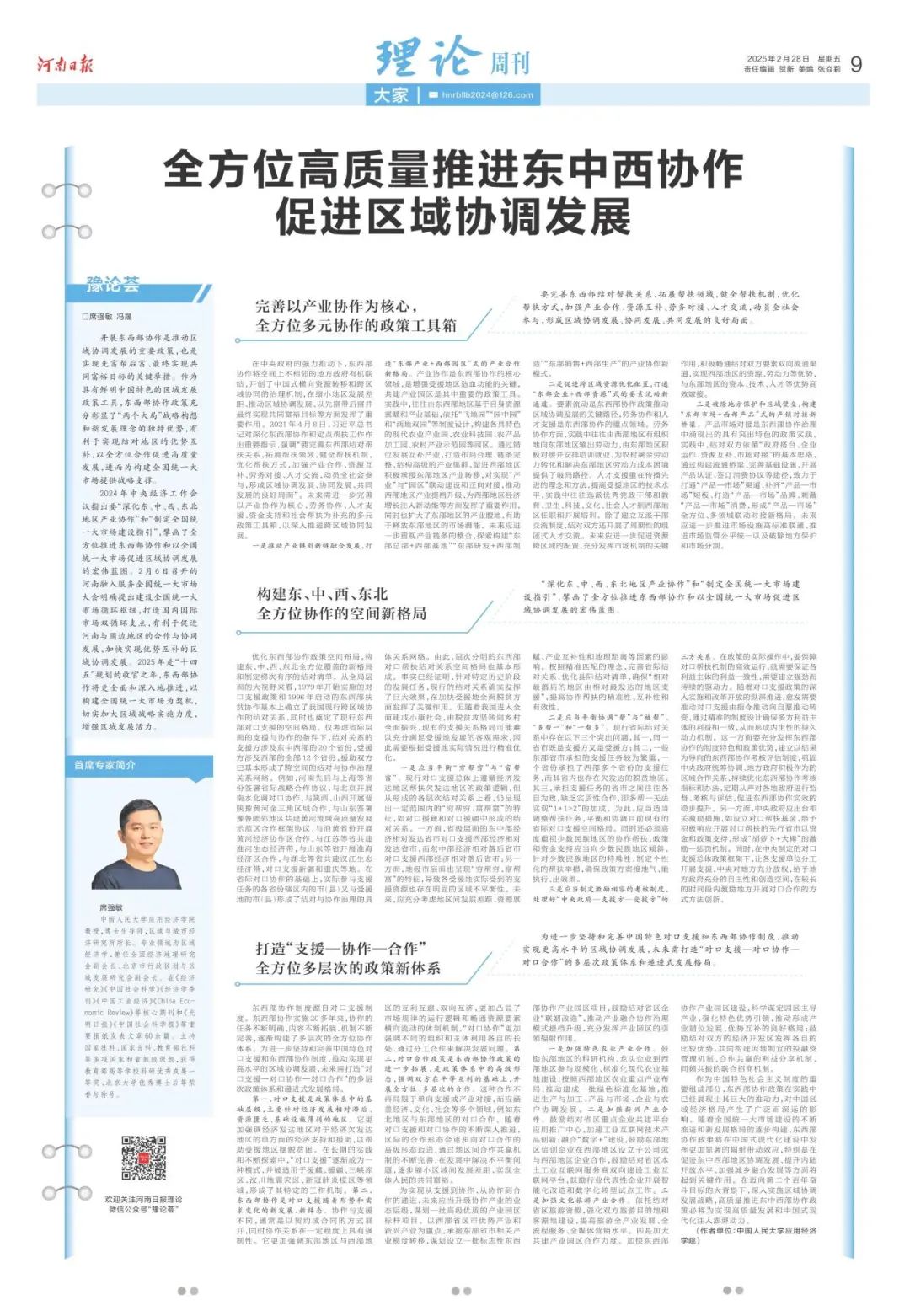 2024年中央经济工作会议指出要“深化东、中、西、东北地区产业协作”和“制定全国统一大市场建设指引”,擘画了全方位推进东西部协作和以全国统一大市场促进区域协调发展的宏伟蓝图。2月6日召开的河南融入服务全国统一大市场大会明确提出建设全国统一大市场循环枢纽,打造国内国际市场双循环支点,有利于促进河南与周边地区的合作与协同发展,加快实现优势互补的区域协调发展。2025年是“十四五”规划的收官之年,东西部协作将更全面和深入地推进,以构建全国统一大市场为契机,切实加大区域战略实施力度,增强区域发展活力。