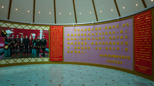 在阿合奇县玛纳斯史诗馆,丰富的图文视频资料向成员们讲述着《玛纳斯》史诗的前世今生,以及《玛纳斯》演唱大师居素普·玛玛依传承发扬的重要贡献。《玛纳斯》是柯尔克孜族的一部英雄史诗,描写了英雄玛纳斯及其七代子孙率领柯尔克孜人民与外来侵略者和邪恶势力进行英勇斗争的事迹,体现了柯尔克孜人民顽强不屈、团结奋进的民族精神。《玛纳斯》史诗集柯尔克孜族民间文学之大成,具有文学、历史、语言、民俗等丰厚价值。此外,展厅中摆放着许多体现柯尔克孜族传统生产生活、文化娱乐的展品,如马鞍、钩刺壁挂、传统服饰等,成员们认真观赏学习、积极交流探讨。在非遗小镇,调研成员们了解了柯尔克孜族的传统民俗文化,体悟到中华传统文化多元一体的深厚底蕴。