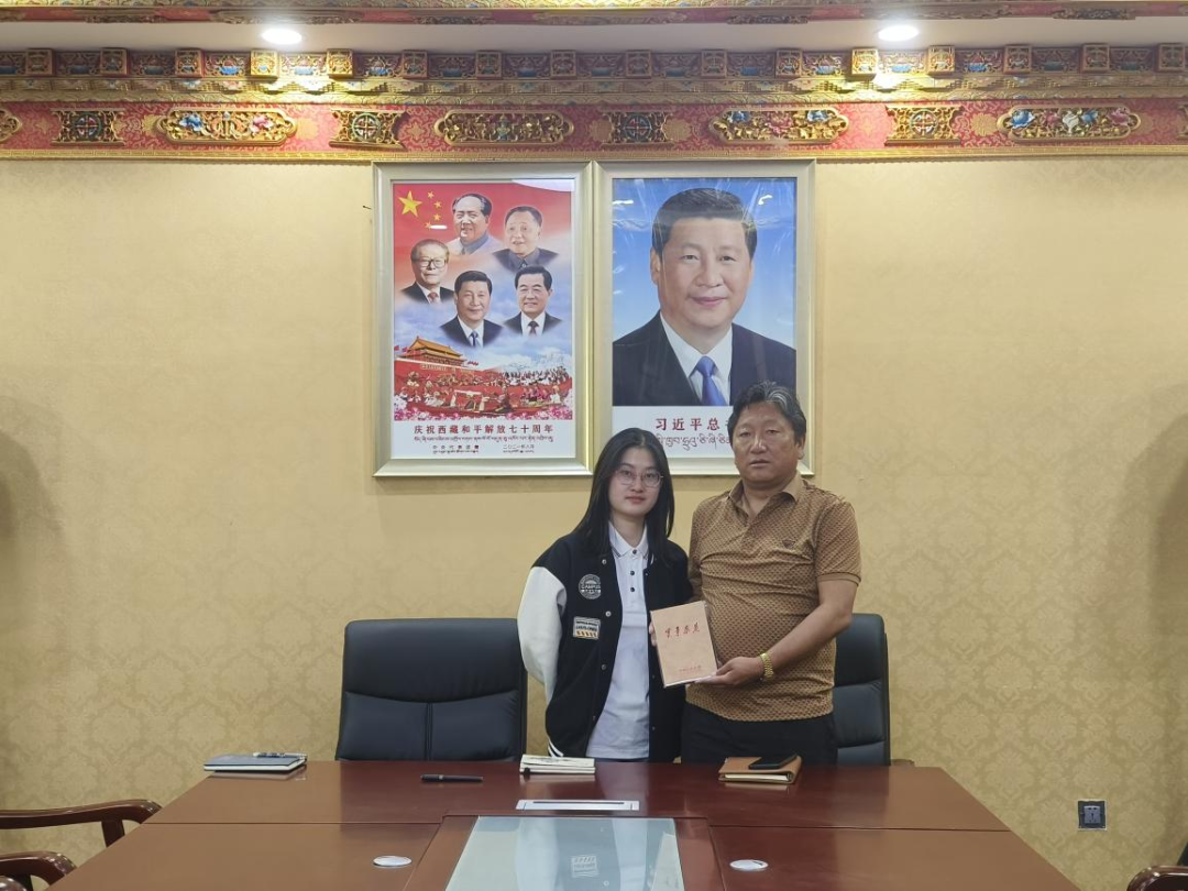 ▲西藏大学经济与管理bl腐漫 硕士生任文丽访谈扎囊县原扶贫办主任罗永忠并合影留念