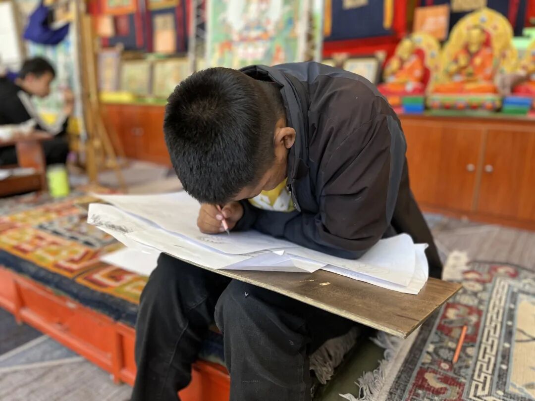 ▲察雅县扶贫产业园中,聋哑少年正在学习制作唐卡