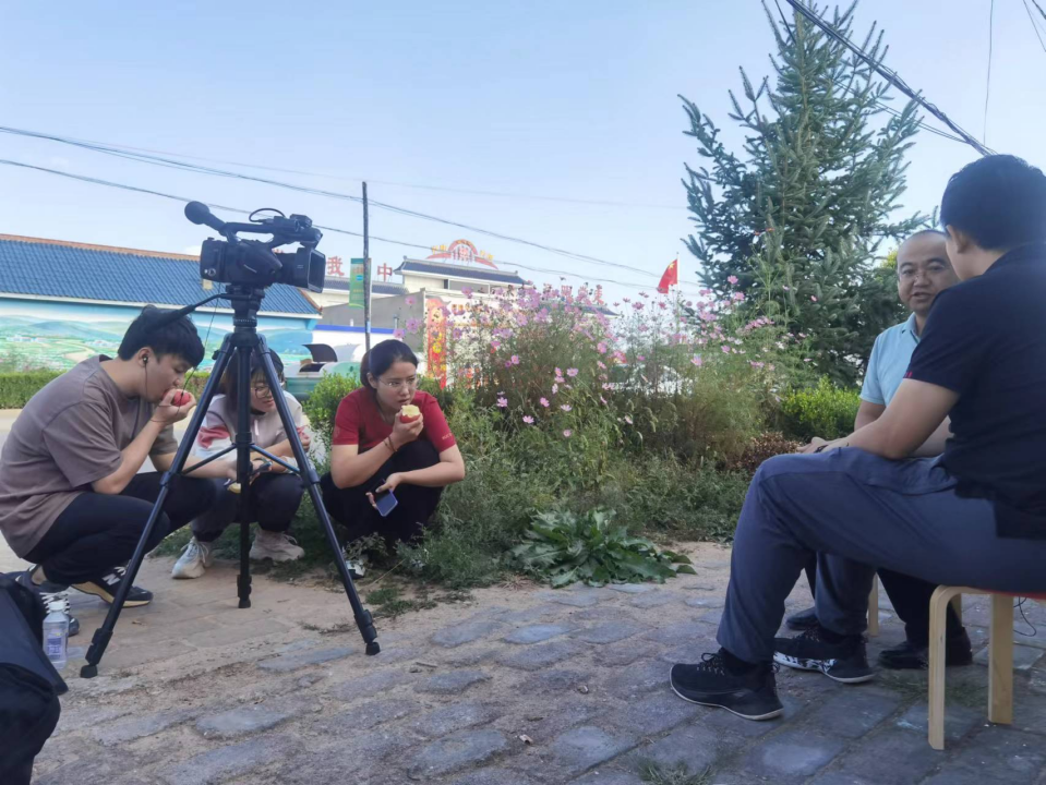 ▲调研团学生边吃当地特产苹果边旁听访谈