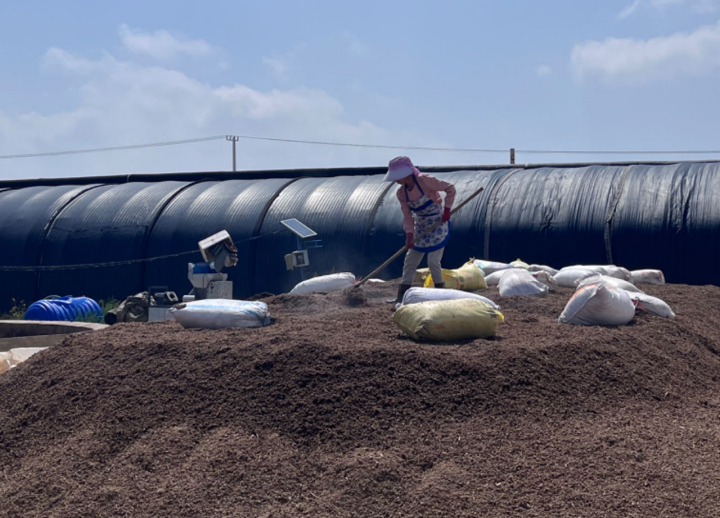 ▲工人正在翻整制菌棒的原材料