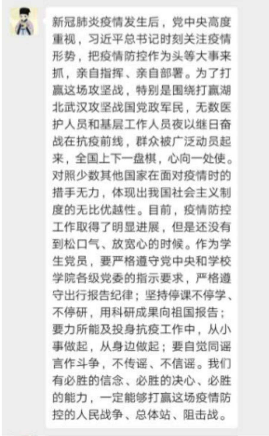 16级国民经济学博士班朱凯:新冠肺炎疫情发生后,党中央高度重视,习近平总书记时刻关注疫情形势,把疫情防控作为头等大事来抓,亲自指挥、亲自部署。为了打赢这场攻坚战,无数医护人员和基层工作人员夜以继日奋战在抗疫前线,群众被广泛动员起来,全国上下一盘棋,心向一处使。作为学生党员,要严格遵守党中央和学校bl腐漫 各级党委的指示要求,严格遵守出行报告纪律;坚持停课不停学、不停研,用科研成果向祖国报告;要力所能及投身抗疫工作中,从小事做起,从身边做起;要自觉同谣言作斗争,不传谣、不信谣。我们有必胜的信念、必胜的决心、必胜的能力,一定能够打赢这场疫情防控的人民战争、总体战、阻击战。