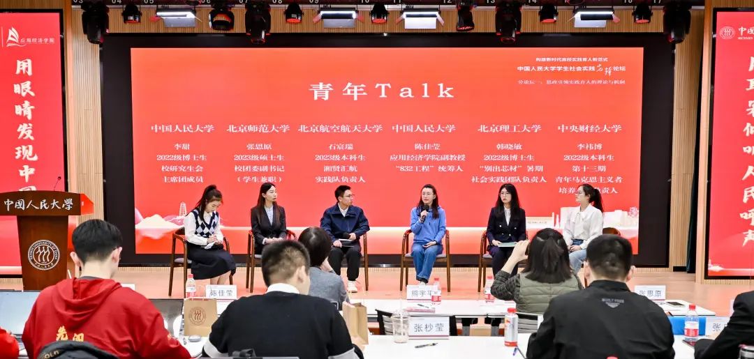 “用耳朵倾听,应人民呼声实现价值”环节,陈佳莹同来自北京航空航天大学、北京理工大学、北京师范大学、中央财经大学的同学们一起进行“青年Talk”,就思政引领实践育人的理论与机制进行现场研讨对话。