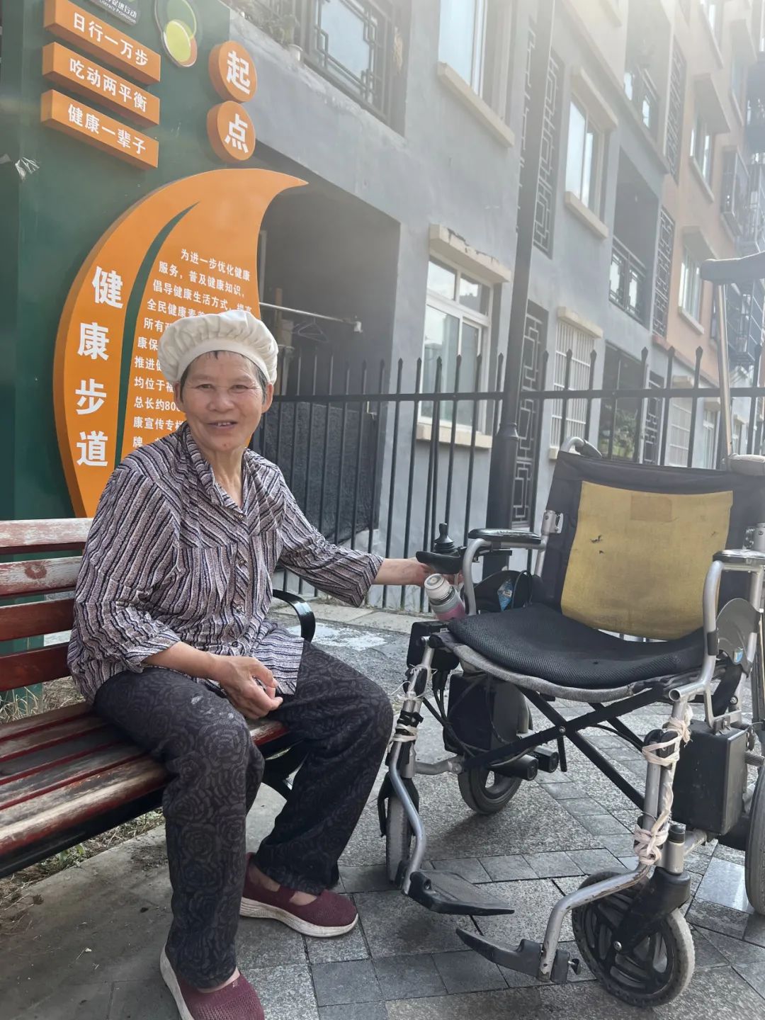 ▲ 社区里的奶奶灵活地坐着电动轮椅出来晒太阳