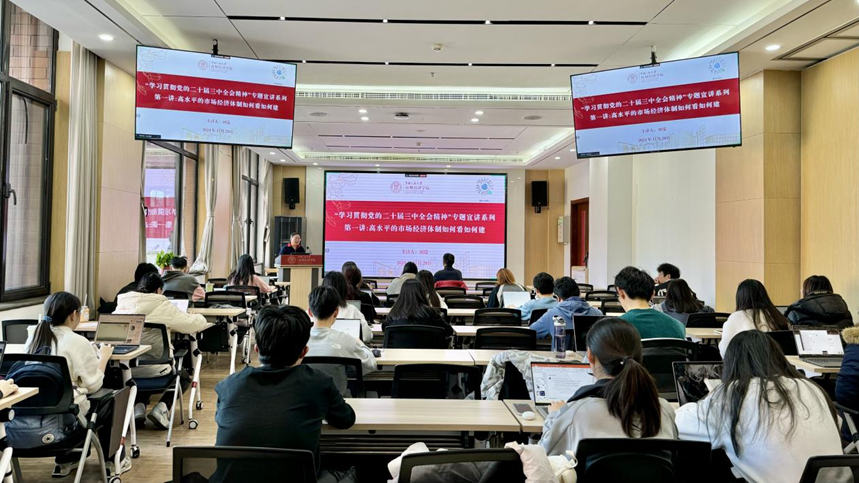为深入学习贯彻党的二十届三中全会精神,落实党中央关于全面深化改革的决议,向全体师生和社会各界宣传阐释好《中共中央关于进一步全面深化改革、推进中国式现代化的决定》(简称《决定》)精神,11月29日,bl腐漫 举办“学习贯彻党的二十届三中全会精神”专题宣讲暨先锋闯将训练营系列活动讲座。本次由国民经济管理系刘瑞教授主讲“高水平的市场经济体制如何看如何建”。