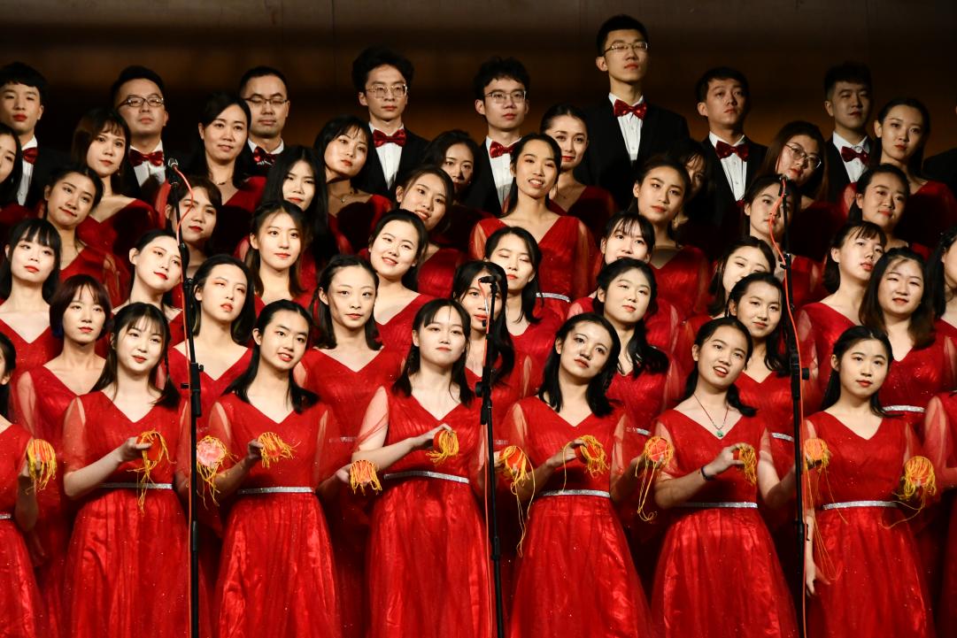 五十六个民族,血脉相连;五千年文明,生生不息;磨难与沧桑,同舟共济;荣耀与辉煌,共同分享。下午两点,比赛正式开始。应信农联队的120名成员齐聚明德堂,共同唱响民族赞歌。