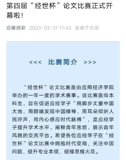 “经世杯”论文比赛是应经学子一年一度的学术赛事。比赛鼓励应经学子将学术与实践相结合,探究学问、解决难题、提升自我。作为学生学术平台,“经世杯”论文比赛引导同学们理论联系实际,关注我国经济社会与文化发展重大问题,产出优秀学术研究成果。