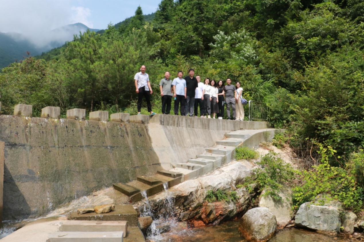 ▲田间地头队在老鸭村供水工程的水坝旁合影