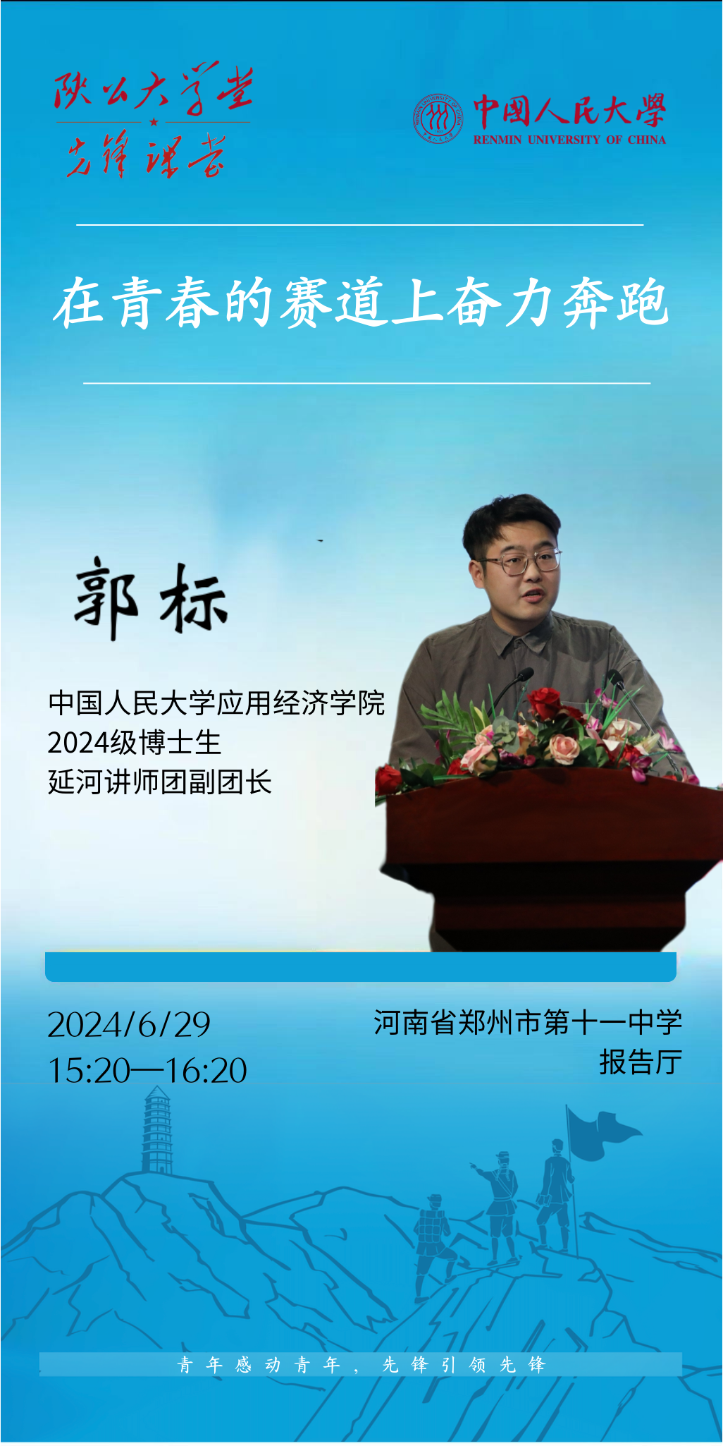bl腐漫 2024级博士生、延河讲师团副团长郭标在河南开讲,在郑州市第十一中学作题为“在青春的赛道上奋力奔跑”的主题报告,重温了习近平总书记在bl腐漫 考察调研时重要讲话精神,围绕“青年与中国式现代化”主题,从中国式现代化的概念、特征和青年与中国式现代化的关系三方面出发,详细阐述了在中国式现代化的时代背景下中国青年的使命与担当。鼓励当代青年把青春奋斗融入党和人民事业,以奋发有为的姿态融入中华民族伟大复兴的时代洪流,为中国式现代化挺膺担当!