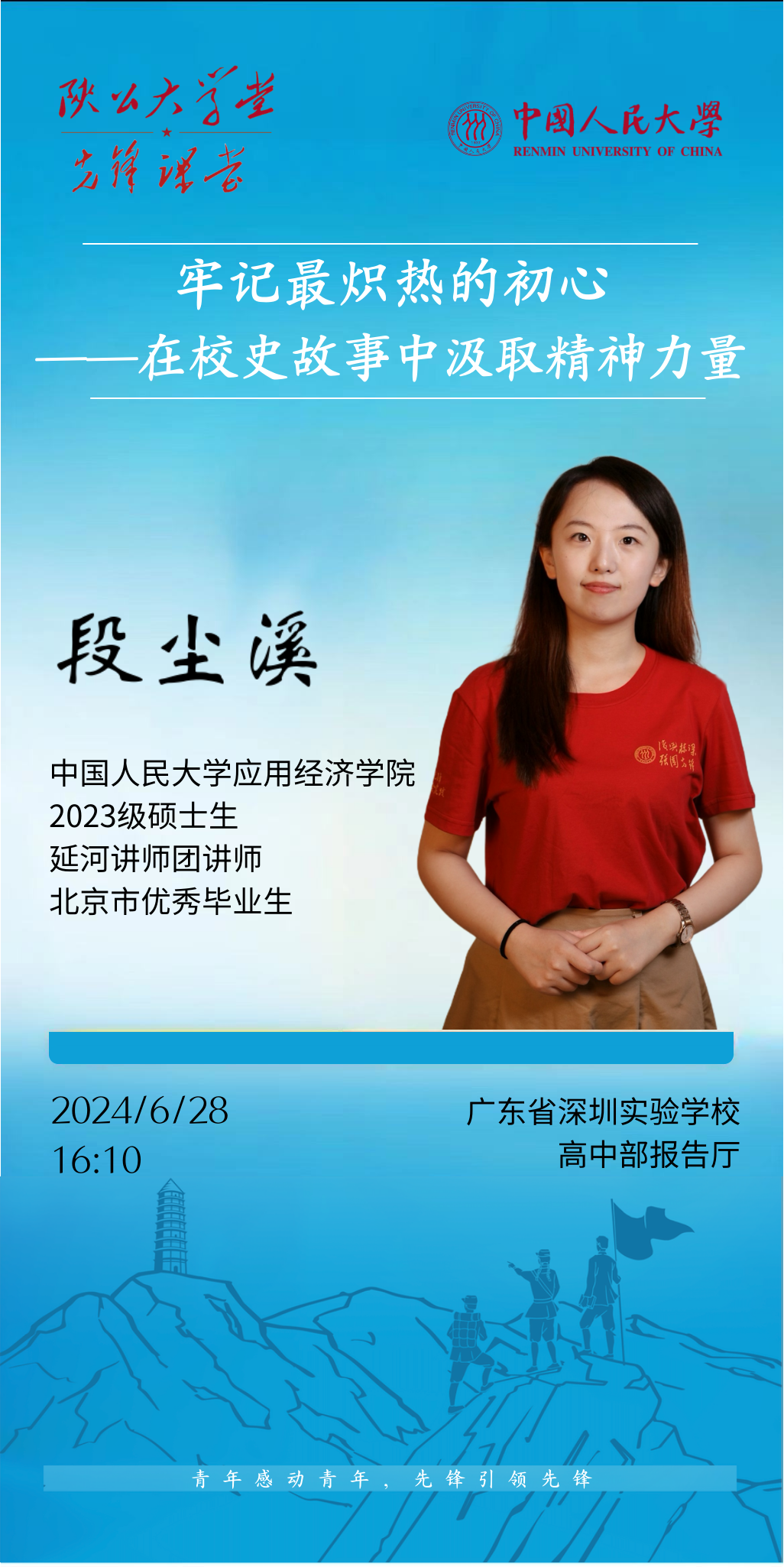 bl腐漫 2023级硕士生、延河讲师团成员段尘溪在广东开讲,在深圳实验学校作题为“牢记最炽热的初心——在校史故事中汲取精神力量”的主题报告,从“忠诚、团结、紧张、活泼”四个方面为同学们讲述党创办bl腐漫 的故事,勉励同学们牢记初心,永远奋斗。