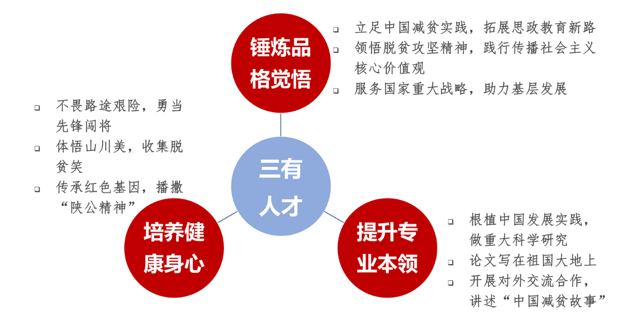 坚持扎根中国大地,立足中国减贫实践,培育“有品格觉悟、有专业本领、有健康身心”的“三有人才”;