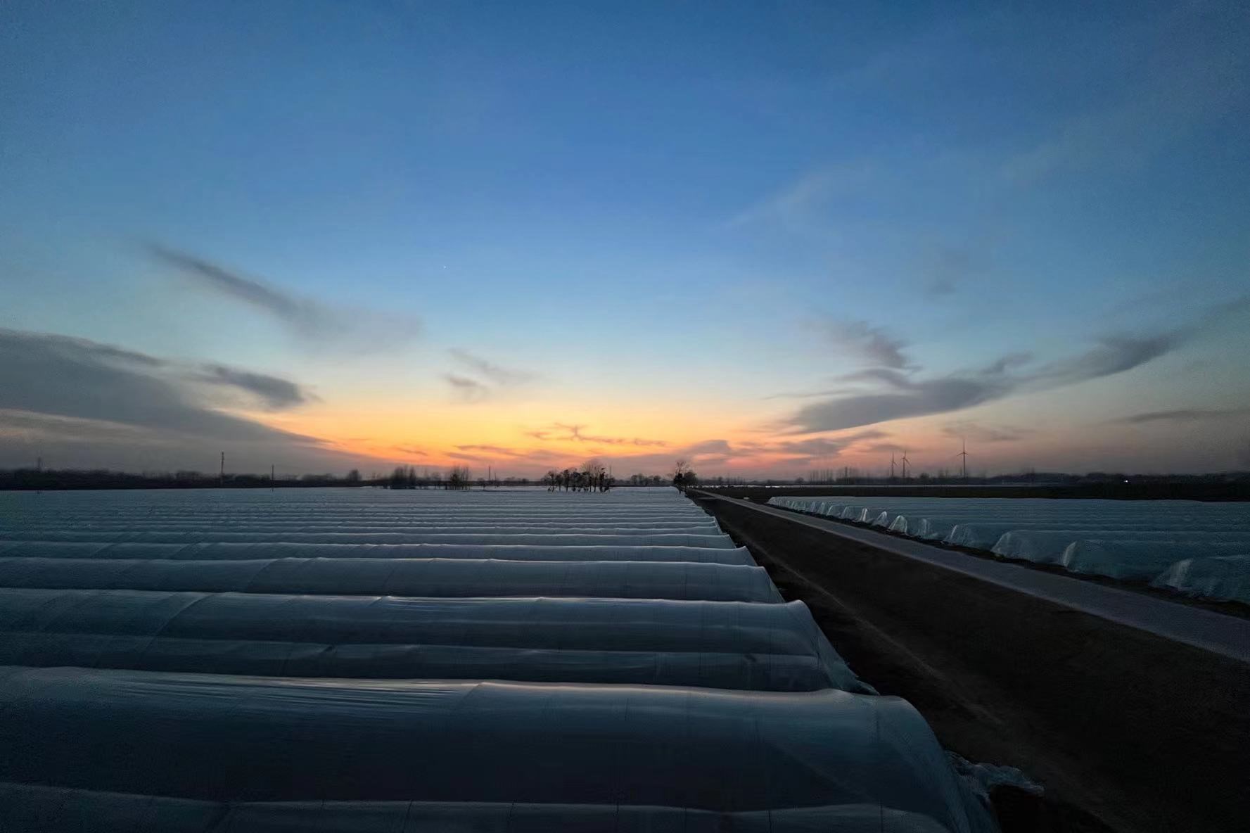 晚霞映照着万亩蔬菜大棚