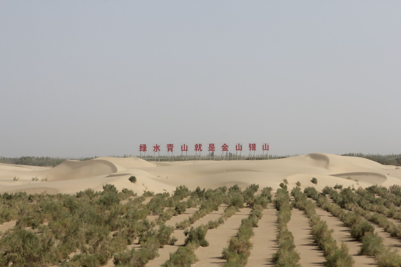 ▲塔克拉玛干沙漠上的百万亩防风固沙林