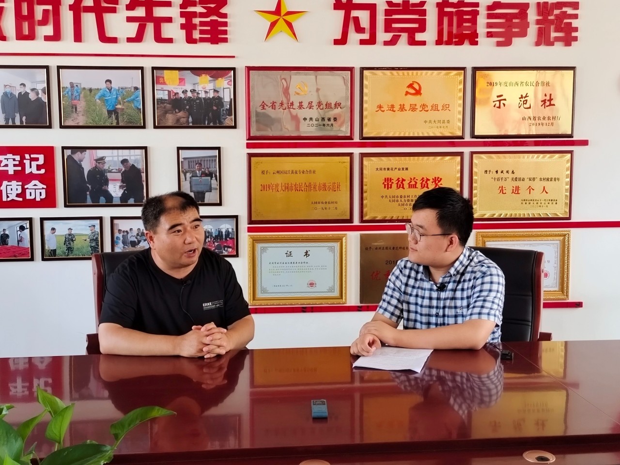 ▲在山西省大同市云州区,本科生魏子轩访谈全国脱贫攻坚先进个人、山西省云州区峰峪乡党委副书记李成,从脱贫攻坚中感悟党的领导力