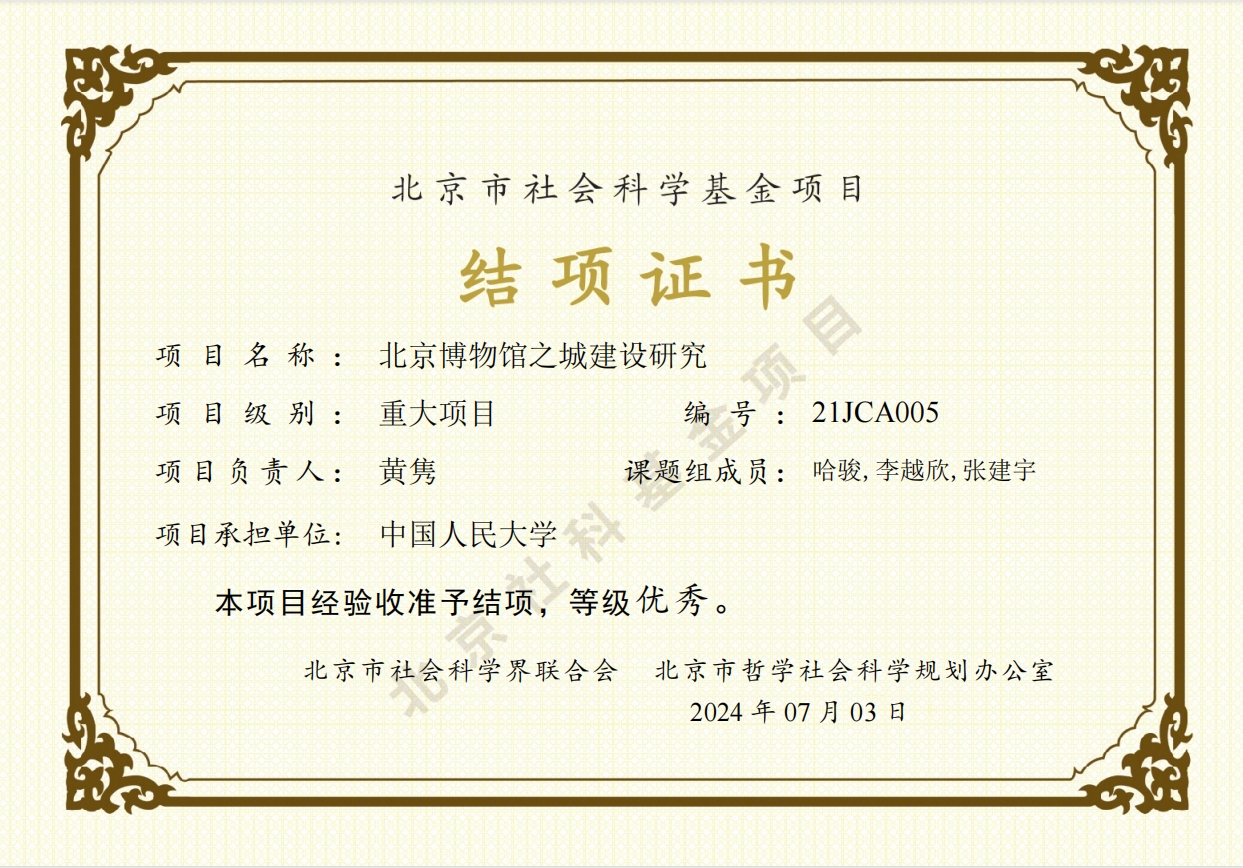 近日,bl腐漫 教授、文化经济研究所所长黄隽负责主持的北京市社会科学基金重大项目《北京博物馆之城建设研究》,经北京市社会科学界联合会、北京市哲学社会科学规划办公室评审专家验收准予结项,等级为优秀。