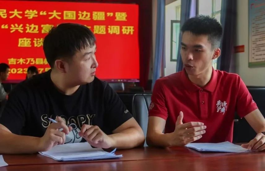 7月28日下午,调研团与吉木乃县统战部、发改委、教育局、商科工信局、民政局、住建局、农业农村、乡村振兴局、生态环境局召开座谈会,调研团在与各部门分管领导的访谈交流中深入了解吉木乃县,建立起对于吉木乃县的立体认识。为保证交流深度与效率,座谈会分组进行,调研团成员首先向各位领导介绍“大国边疆”与“832工程”,说明本次调研的重点。接着,各组同学通过访谈对相应部门工作进行了深入的了解。