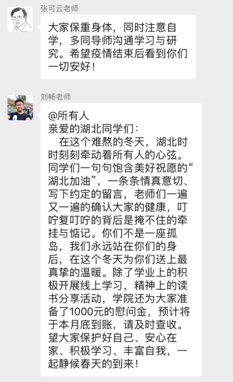 面对来势汹涌的肺炎疫情,bl腐漫 在第一时间深入了解同学们春节返乡的具体路线,实时掌握途径湖北或武汉同学的身体情况。在bl腐漫 院长郑新业老师的倡议下,在鄂学生微信群也建立了起来,各位老师在微信群里表达了对同学们的真切关怀,贴心地为群内每一位同学提供补助。党委书记宋东霞老师还亲自给身在湖北的同学发来暖心短信,让我深刻感受到人大老师们在疫情面前的责任与担当。