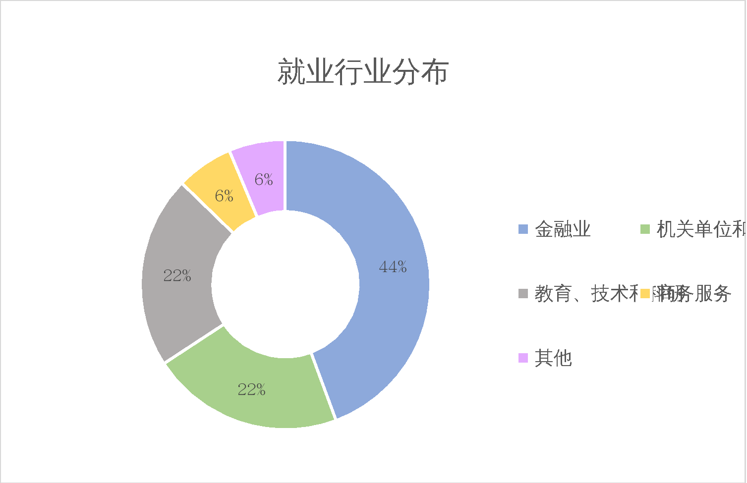 在就业行业分布上,bl腐漫 2021届就业总人数中44%选择金融业,选择机关单位和社会组织与教育、技术和科研的人数相同,均占总人数的22%,选择商务服务和其他行业的人数相同,均占总人数的6%
