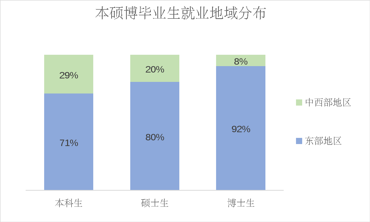 在就业地域分布上,本科生中71%选择东部就业,29%赴中西部就业;硕士生中80%选择东部就业,20%赴中西部就业;博士生中92%选择东部就业,8%赴中西部就业。