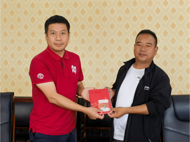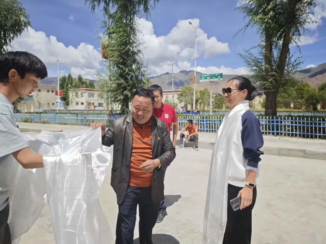 白朗现代藏式服装厂负责人为访谈团戴上哈达