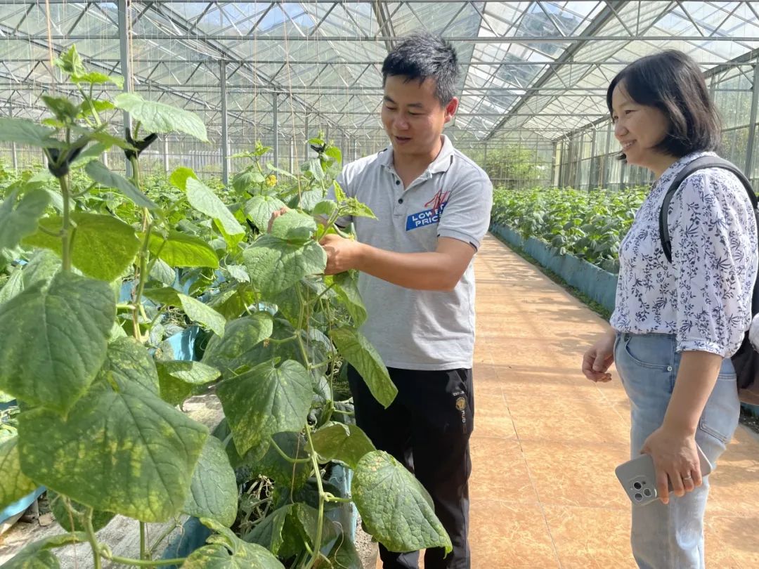▲湾滩河镇党务政务综合服务中心主任杨杰向张红霞展示水果黄瓜