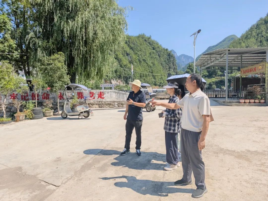 7月30日上午,调研团来到白沙镇青龙嘴村调研集体经济产业发展情况。在观景平台,调研团俯瞰青龙嘴村全貌。整洁的灰白村落、清澈的河流、恬静的农家小院和芳香的果园交相辉映,处处彰显发展村集体经济带来的可喜变化。
