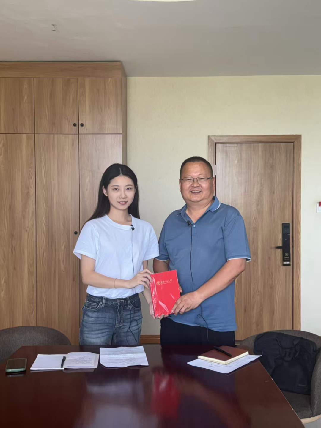 ▲博士生杨宇婧访谈岳普湖县原乡村振兴局局长汤建荣并赠书留念