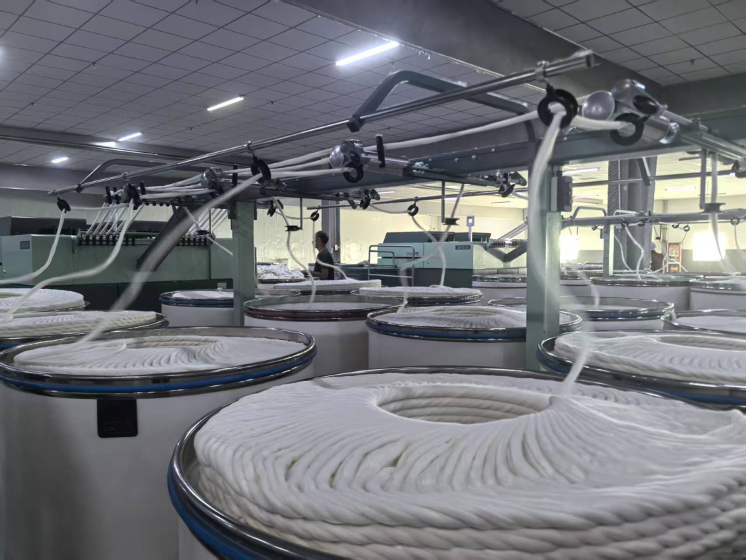 7月24日上午,调研团到达岳普湖县精密纺织厂开展调研。走进生产车间,清花设备正有条不紊地高效运转着。巨大的机身矗立在车间中央,进料口处,一捆捆原棉被有序地送入设备内部,打手部件以强劲的力度击打着棉层,进一步将棉纤维与杂质分离,经过初步清理的棉纤维,顺着输送管道,缓缓流向下一道工序。