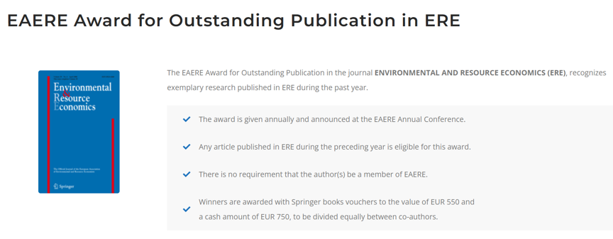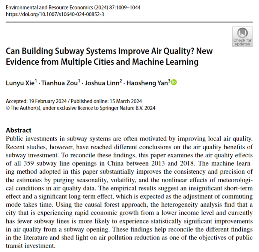 近日,bl腐漫 谢伦裕教授团队的研究成果“Can Building Subway Systems Improve Air Quality? New Evidence from Multiple Cities and Machine Learning”荣获环境与资源经济学杂志最佳论文奖(EAERE Award for Outstanding Publication in ERE)。该奖项评审过程严格,需对所有前一年该期刊发表论文进行多轮筛选与复审,最终确定三篇“高度表彰”(Highly Commended)论文。