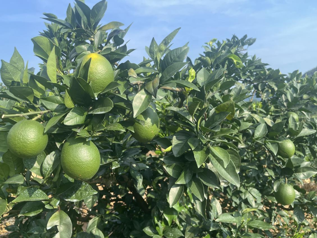 ▲富川瑶族自治县浮田村“梦里橙花”脐橙产业示范区的橙子