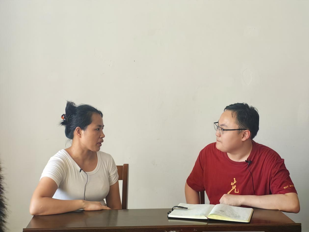 ▲王雨桉访谈富川瑶族自治县岔山村脱贫户代表卢雪花