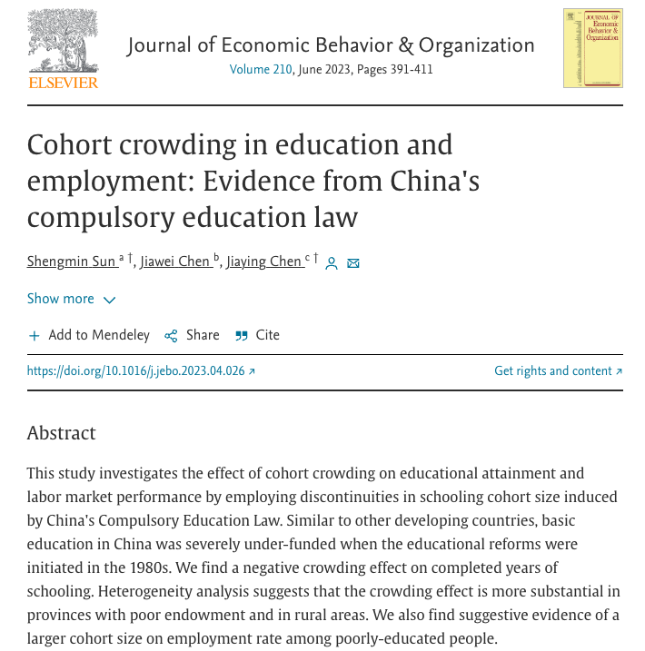 近日,我院助理教授陈佳莹与其合作者的论文“Cohort crowding in education and employment: Evidence from China's compulsory education law”被国际权威期刊Journal of Economic Behavior & Organization接受发表,并在线刊出。(//doi.org/10.1016/j.jebo.2023.04.026)。陈佳莹为该文的通讯作者。