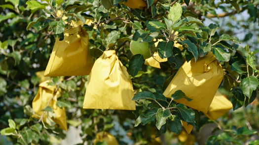 ▲套袋中的山地苹果
