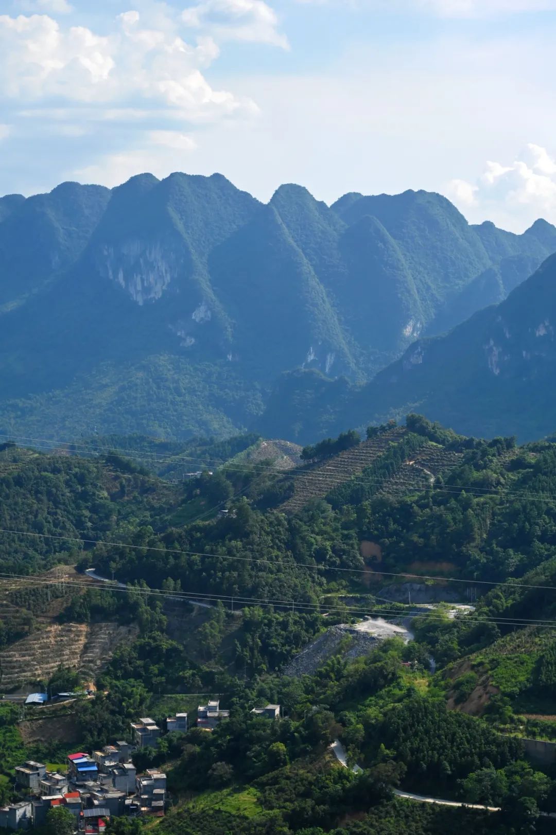 群山环抱中,民居、梯田星罗棋布