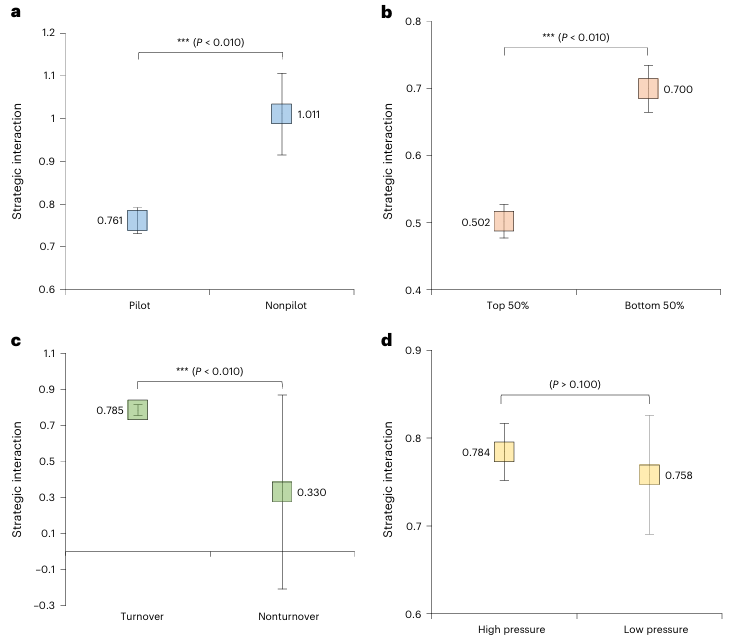 图2 城市碳减排策略互动效应异质性分析(a. 低碳试点城市和非试点城市比较;b. 碳强度排名前50%城市和后50%城市比较;c. 领导换届年和非换届年比较;d. 碳达峰高压力组和低压力组比较。方框为效应均值,上下误差线为95%置信区间)