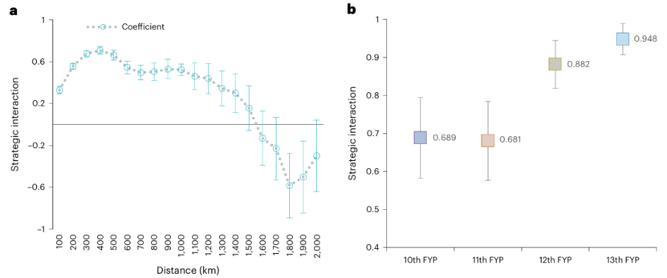 图1 城市碳减排策略互动效应的时空异质性(a. 不同空间距离的效应,灰色虚线是效应均值,蓝色实线为95%置信区间;b. 不同的五年计划时段的效应,方框为效应均值,上下误差线为95%置信区间)